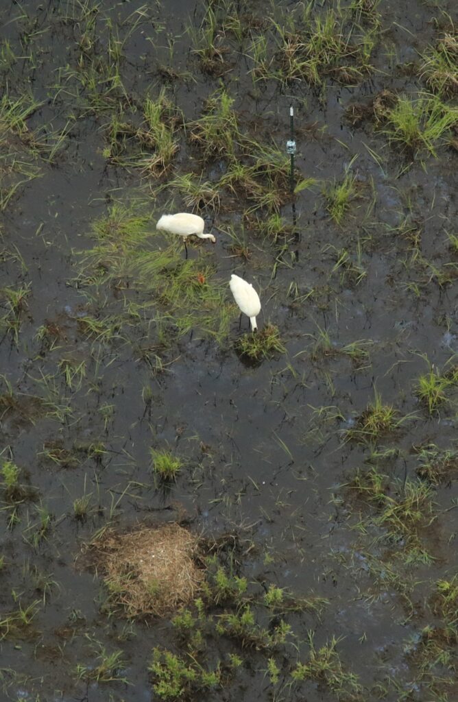 This nest is only the second nest produced by a DAR (Direct Autumn Release) bird, and the first chick hatched by a DAR bird. Concern about the family grew when mother crane #27-05 was reported missing on June 30. She had a non-functional transmitter so she couldn’t be tracked. Her mate, #12-04, continued to tend the chick until the chick disappeared July 3-6, and #27-05 DAR came back to her mate again on July 12.