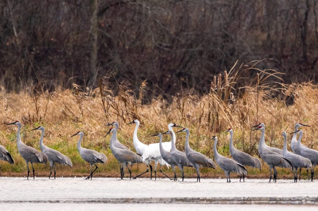 On Dec. 1, #46-07 got back on track with the help of ICF tracker Richard Urbanek and intern Eva. They caught #46-07 in Arkansas and drove her to Hiwassee State Wildlife Area in Tennessee. They released her that evening in a great place for cranes. The next day she was in a place with thousands of Sandhill Cranes and adult Whooping Crane #20-04! (photo) Experts hope she will stay with her own species so that someday she can mate and raise more Whooping Cranes for the new Eastern flock. She remains in Tennessee at this date.