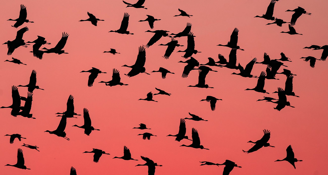 Photo: Sandhill Cranes take flight over the Platte River in Nebraska. Ryan Michalesko/International Crane Foundation