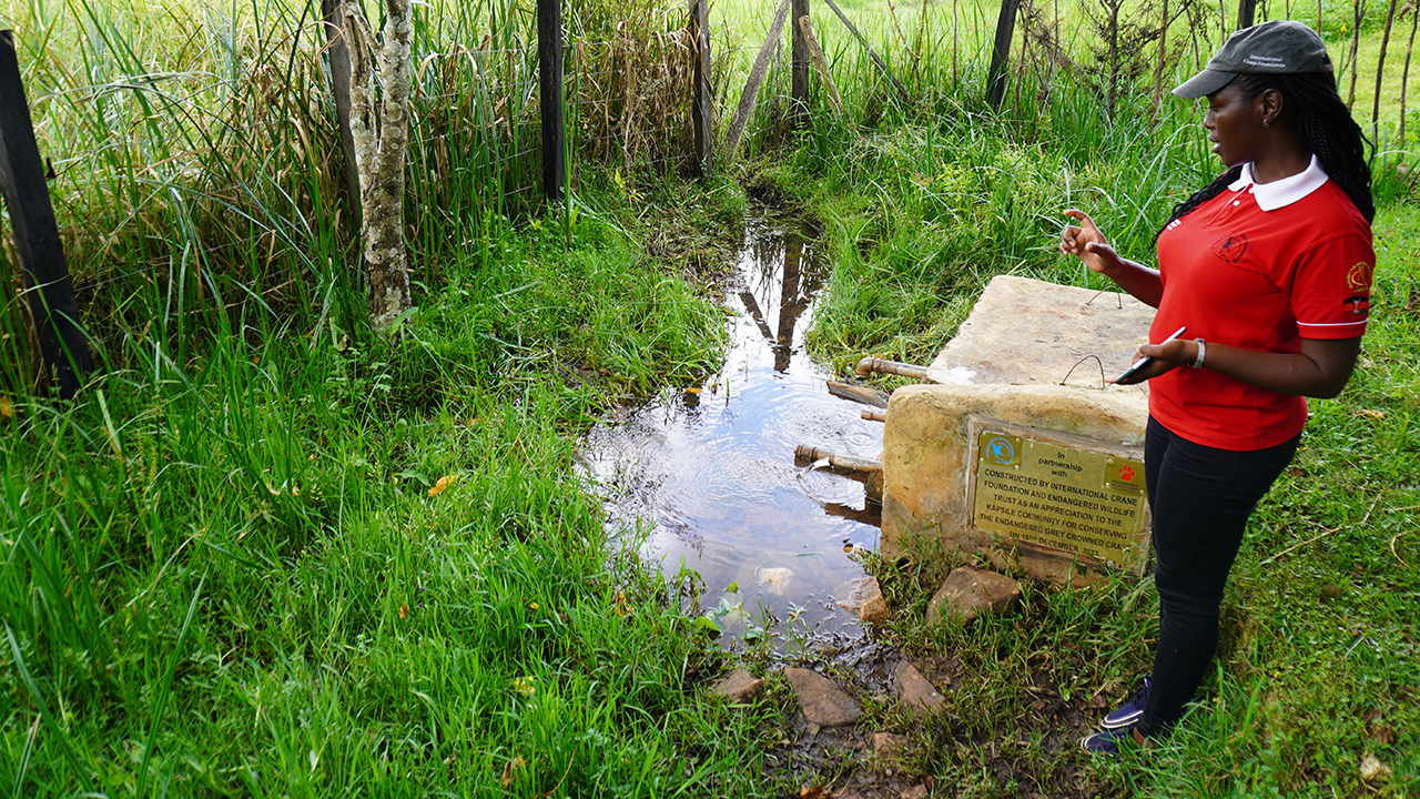 Senior Field Officer Eva Tokoi shares an improved outlet for a freshwater spring. Rather than going deep into the wetland to collect water, community members now use the spring outlet to safely provide water for their families while reducing disturbance to cranes. Sara Gavney Moore/International Crane Foundation