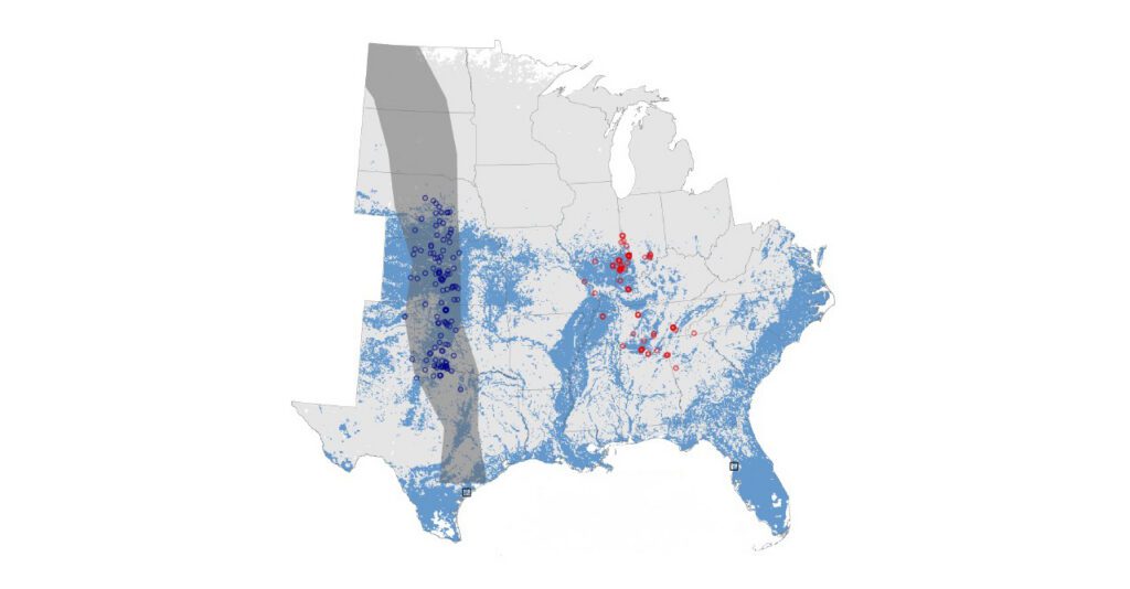 The two populations of North America’s migrating Whooping Cranes exhibit vastly different behaviors on their journey south. The remnant Aransas-Wood Buffalo Population (AWBP) migrates about 2,500 miles along the Central Flyway to reach their historic wintering grounds in coastal Texas. The Eastern Migratory Population (EMP), a reintroduced population established in 2001, was originally taught to fly to coastal Florida to salt marshes that mimic the conditions of the wintering habitat in Texas.