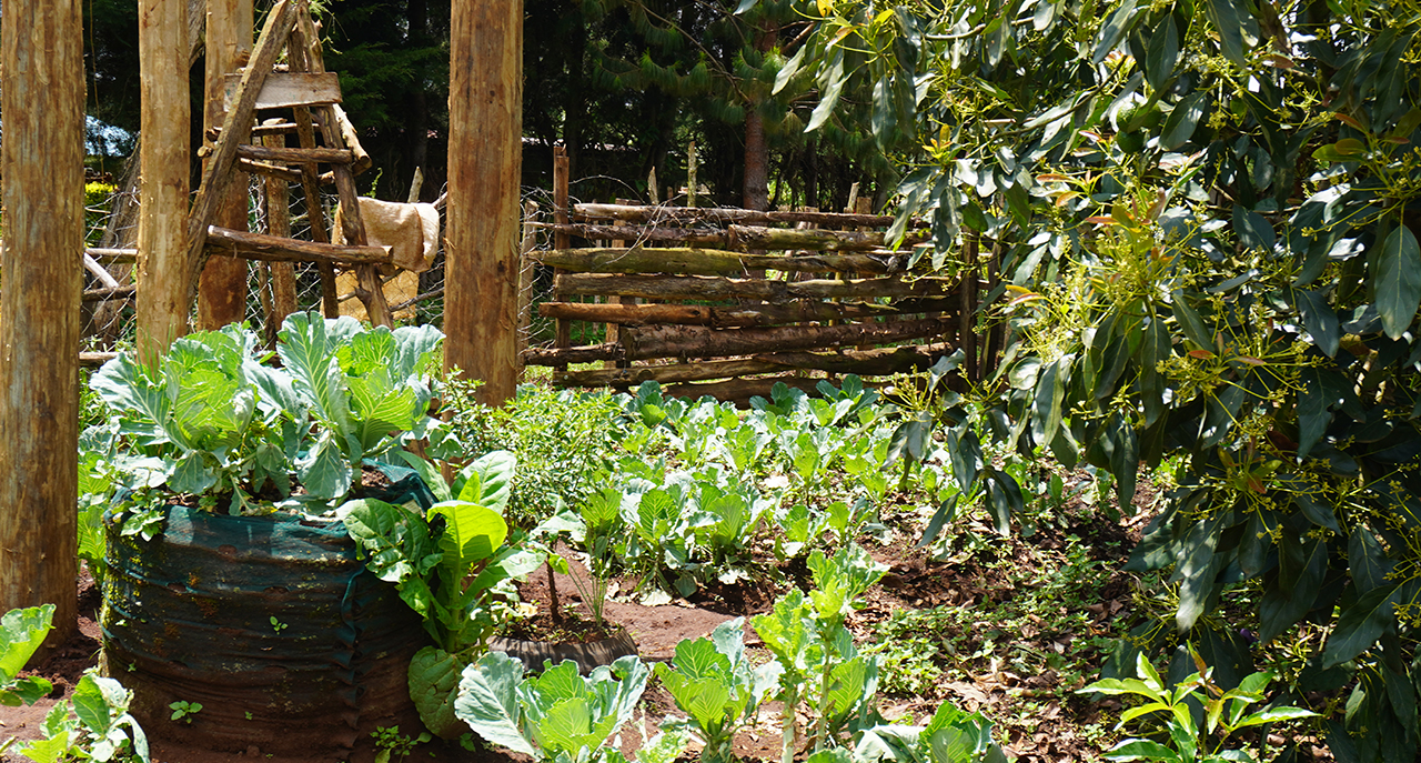 A farm in Nandi County, Kenya, demonstrates climate-smart agriculture techniques. An avocado tree anchors the center of the garden (on the right). Sara Gavney Moore/International Crane Foundation