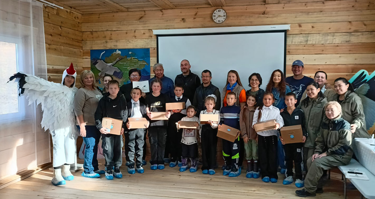 After the ceremony, the visiting researchers presented various lectures and games to the 10 pupils from the village’s school. Photo courtesy Flight of the Siberian Crane Project.