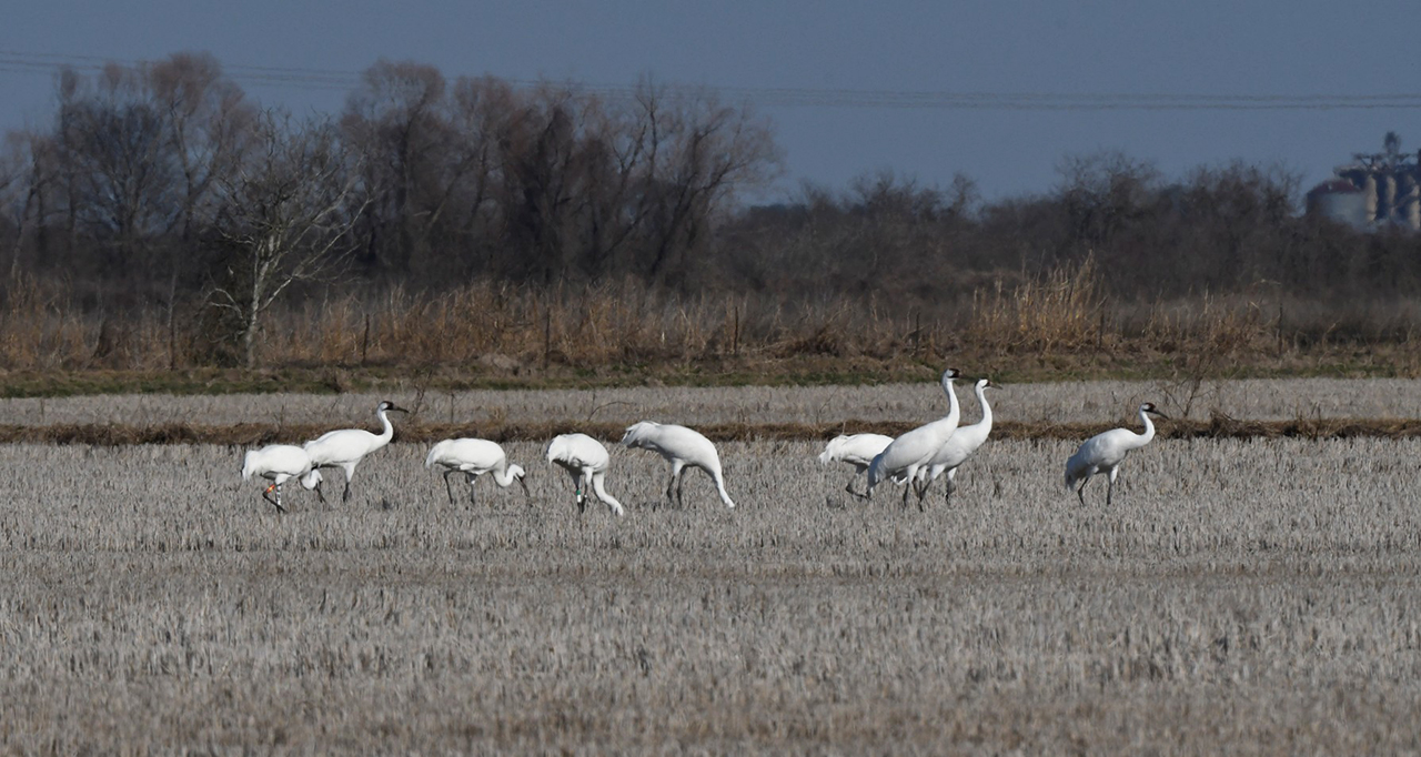 Group of nine Whooping Cranes in Colorado County in a recently harvested rice field. Matti Bradshaw/International Crane Foundation