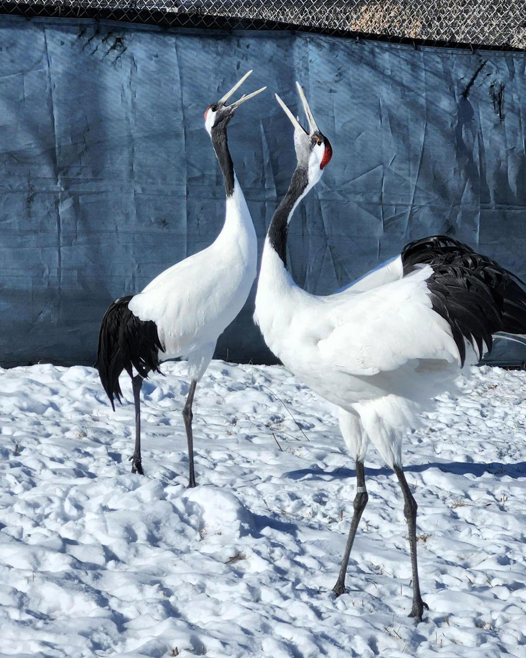 Zhou Ming and Ginny are our newest pair of Red-crowned Cranes. Zhou Ming is 40 years old, and he’s a bit of a “grumpy old man” at times (but we love him anyways) and had been unaccepting of other possible mates. Last year, Ginny joined the International Crane Foundation’s flock from Minnesota and was housed next to Zhou Ming so they could get to know one another. Ginny liked Zhou Ming right away, and although he seemed a bit unsure about her at first, she grew on him, and they progressed in their socialization quickly. Ginny is a very energetic bird, and she loves to dance circles around Zhou Ming (often literally), which keeps him active too!