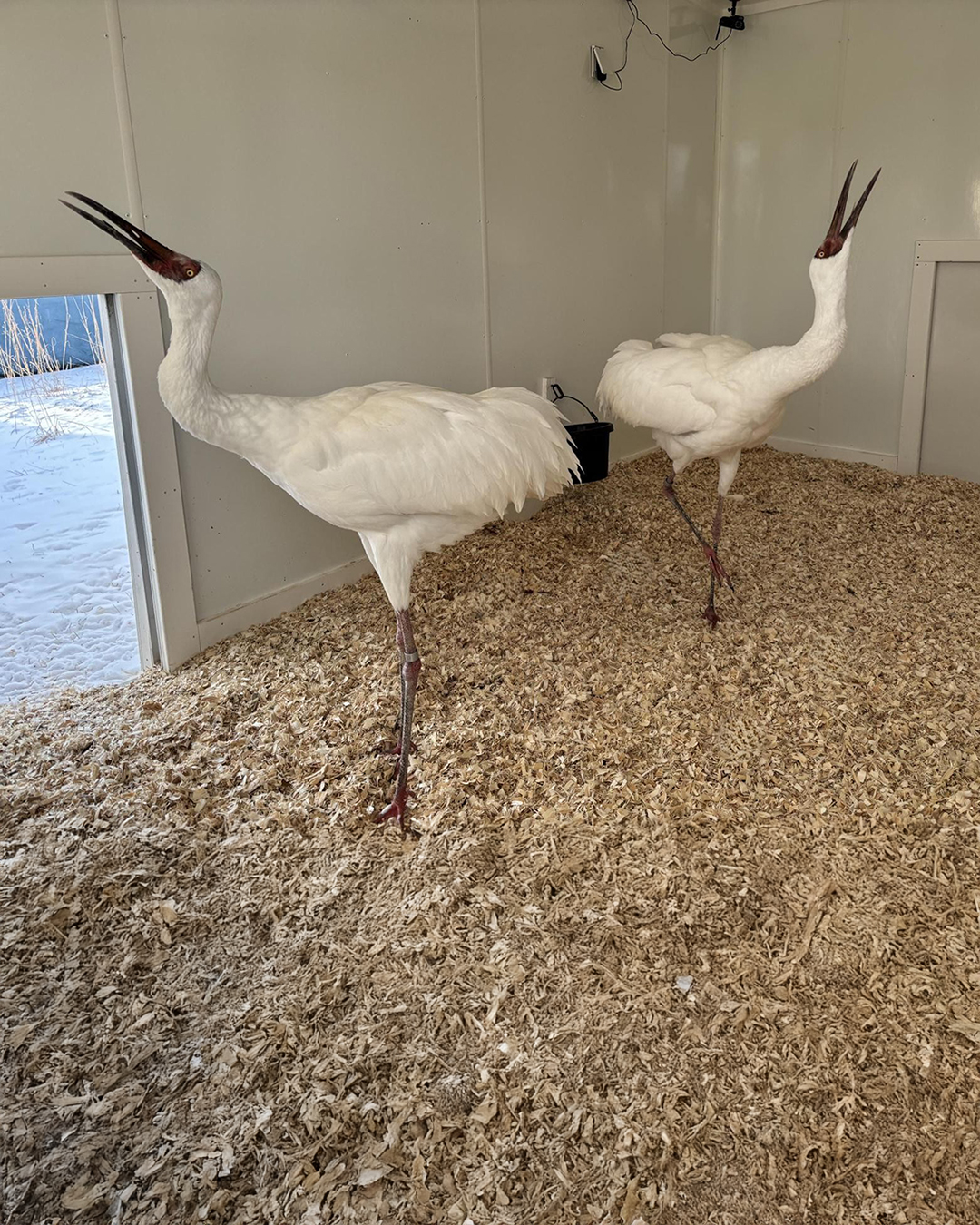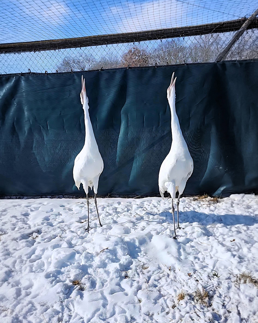 To facilitate this behavior in Crane City, we have special socialization pens where birds share a common fence line both in their outside yards and in their houses, so they can get used to being next to each other and sharing a house, while still having a barrier for protection. We monitor potential pairings in these yards for signs of interest and comfort with each before starting their supervised visits. These initial introductions usually begin at 30 minutes and increase in small increments, slowly building up to them living together full-time. We let the birds’ behaviors show us when they are ready to move on to the next step, so some socializations take days or weeks, while others can take months to years, and some just might not work out at all. Some of the signs we look for in a successful socialization are synchronized calling and dancing together, being comfortable sleeping and preening in close proximity, and sharing food and water.