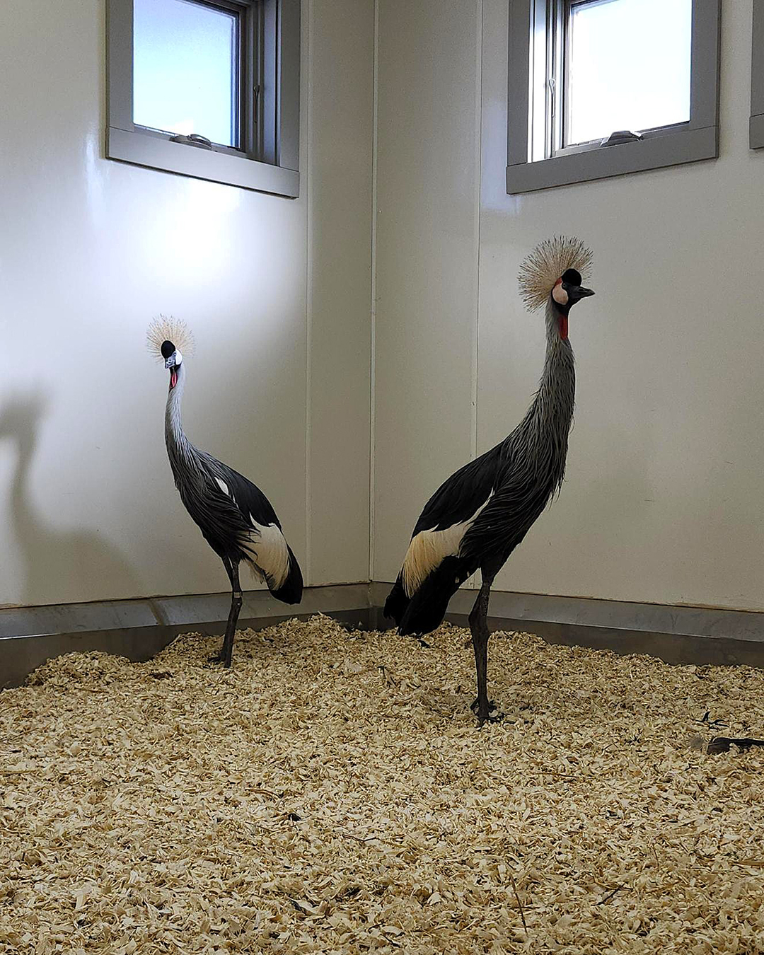 Grey Crowned Cranes Tina and Ichabod, soulmates from the start, were paired in four days. We knew Tina was very interested in Ichabod because she was seen allopreening him on their second day together. Allopreening means they will actually groom each other. Crowned cranes are one of the few crane species that regularly engage in allopreening, so it is really a sight to see! We are excited for you to visit them at our Crane Discovery Center this spring!