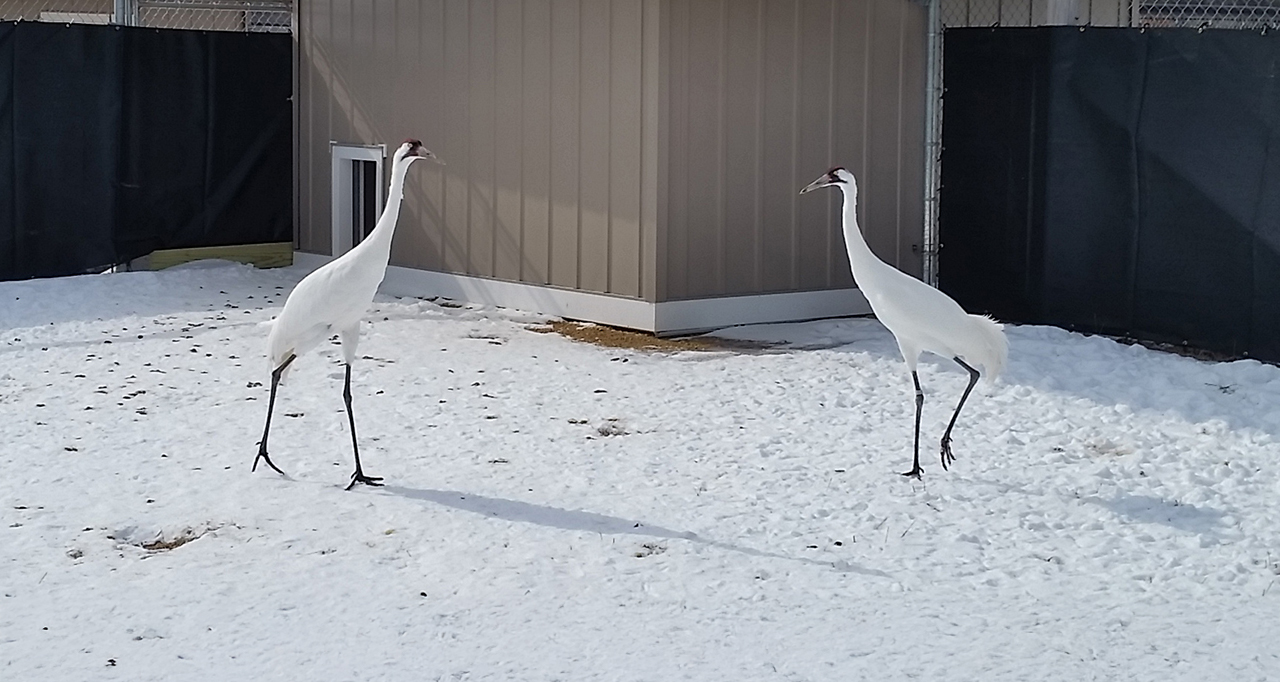 If you ask the Crane Conservation Department—our aviculture team responsible for the daily care of our flock—what’s going on with our cranes during the winter months, you will likely hear us talk about “socialization.” This means we are working on introducing unpaired cranes to one another and allowing them to pair up…or not. Most of our socialization work takes place in our breeding facility, Crane City. We choose to socialize during the winter months because that is when most of the cranes are out of their breeding season and, in the wild, would be more likely to be socializing in groups and looking for mates. Behaviorally, they are more accepting of a new bird entering their yard and sharing their resources.