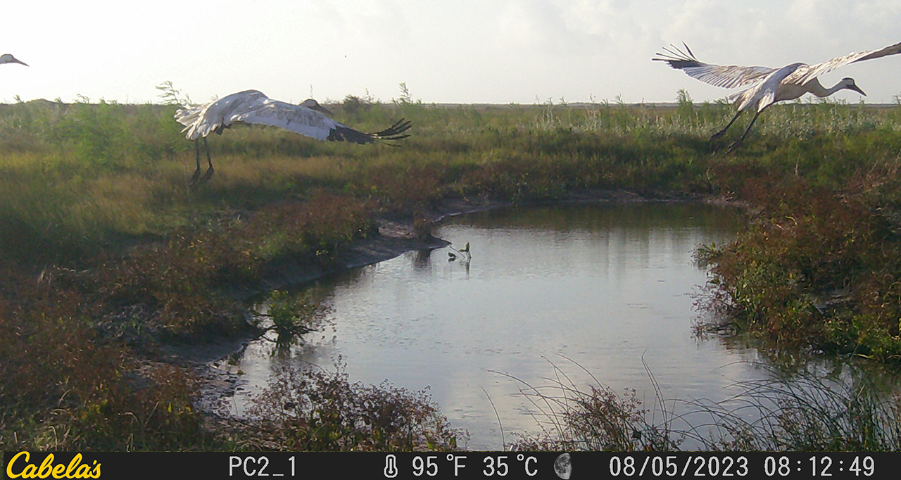 Three over-summering Whooping Cranes captured on a trail camera at a freshwater pond in Texas in August 2023.
