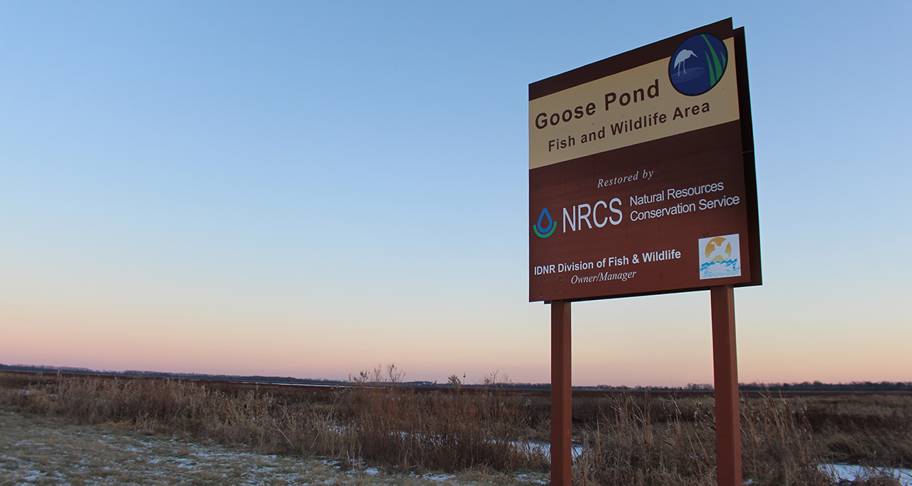 The sign for Goose Pond Fish and Wildlife Area. In the background are acres of open wetlands and prairies. Photo by Dan Kaiser