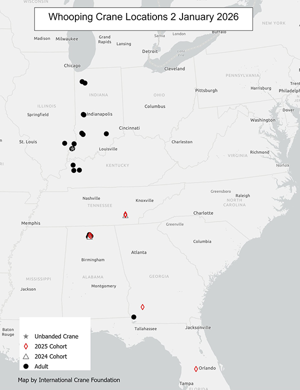 Below is the most recent update for the Eastern Migratory Population of Whooping Cranes. During December, the 2025 cohort appears to be doing well, and cranes migrated south to their wintering grounds! A huge thank you to the staff of the Fish and Wildlife Service, the Departments of Natural Resources of flyway states, the International Crane Foundation, and all the volunteers who help us keep track of the cranes throughout the year. We appreciate your contribution to the recovery of the Whooping Crane Eastern Migratory Population. The International Crane Foundation produced this report.