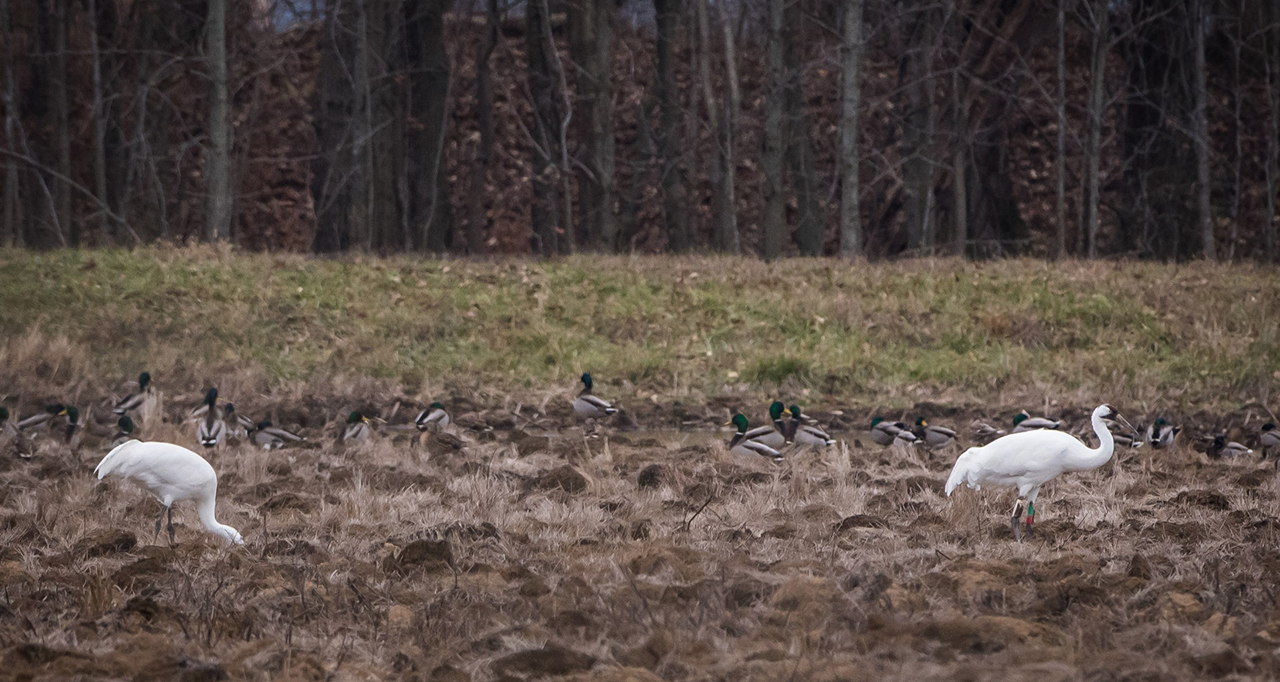 Two Whooping Cranes forage near mallards and Canada geese in Gibson County, Indiana. Photo by Richard Vernier