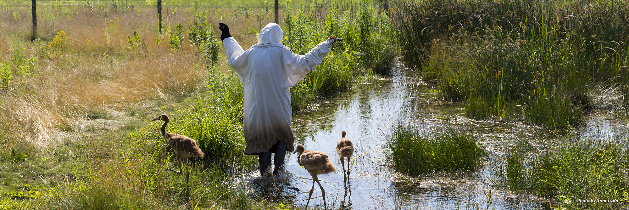 Chicks raised in captivity may be reared by adult Whooping Crane pairs or by our staff, who wear full-length crane costumes to hide the human form while working with the young cranes. We use this costume-rearing technique to make sure the chicks imprint on Whooping Cranes (the costume and hand puppet mimic the colors and shape of an adult crane) and are prepared for life in the wild.